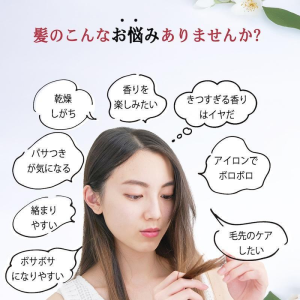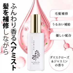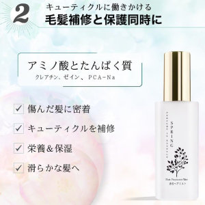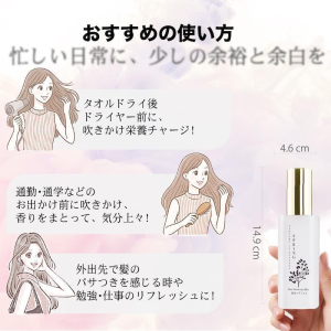 【ご使用方法】髪の乾燥が気になる時、リフレッシュしたい時に、髪から10~20cmほど離して、2~3回スプレーして使います。さらりとしたテクスチャーで、気になる時に何度お使いいただいてもべたつきません。