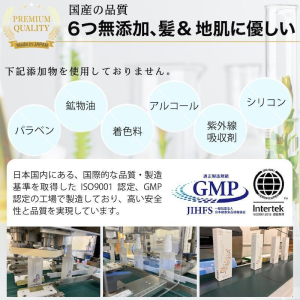 ■ 6つの無添加。パラベンフリー、アルコールフリー、鉱物油フリー、着色料無添加、シリコン無添加、紫外線吸収剤不使用。髪と頭皮にやさしい配合となっています。